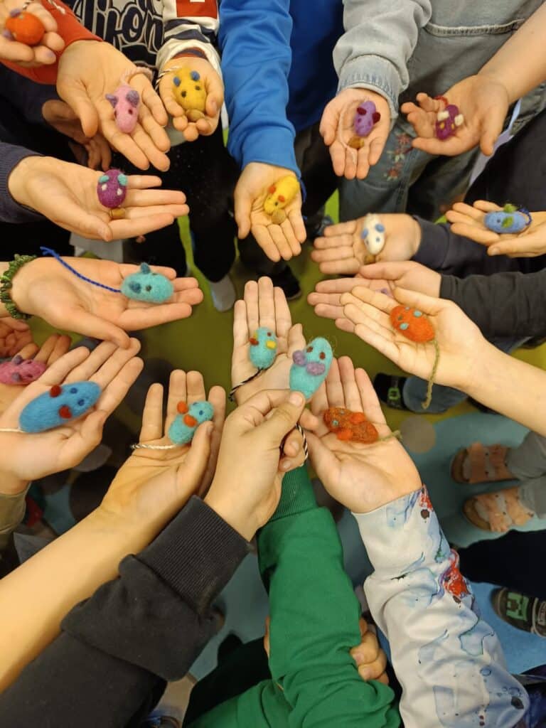 Am 10.4. fand in der 2. und 3. Klasse ein Filz – Workshop statt. Nach dem aufmerksamen Zuhören eines Märchens wurden die Kinder selbst aktiv und fertigten eine Blume bzw. ein Mäuschen in der Nassfilztechnik an.